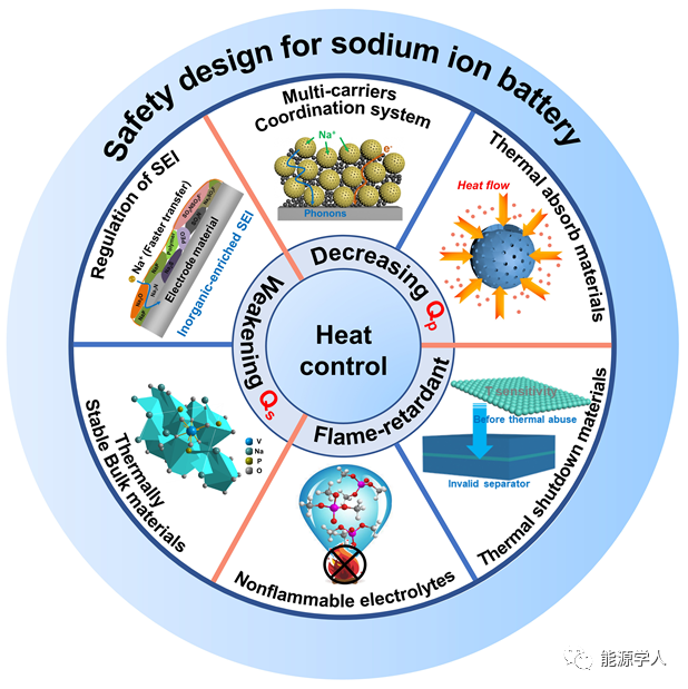 近期,武漢理工大學(xué)麥立強(qiáng)教授(通訊作者)和尤雅教授(通訊作者)從材料層面總結(jié)與分析了電池中主要產(chǎn)熱來源,熱失控過程引起的化學(xué)反應(yīng)、衡量電池安全性的重要參數(shù),并討論了為降低熱效應(yīng)電極材料的設(shè)計(jì)準(zhǔn)則。第一作者為武漢理工大學(xué)博士研究生楊超。文章主要圍繞減少電池內(nèi)部極化熱(Qp)和副反應(yīng)熱(Qs)、加快熱傳遞速率、阻燃和功能性熱保護(hù)材料做了詳細(xì)探討。該文重點(diǎn)關(guān)注電池的熱行為,并提出一些潛在可行的策略,這將加深對SIBs熱失控的了解,并加速熱安全體系電池材料的設(shè)計(jì)。該工作發(fā)表于材料領(lǐng)域期刊Advanced Energy Materials,題為“Materials Design for High-Safety Sodium-Ion Battery”。