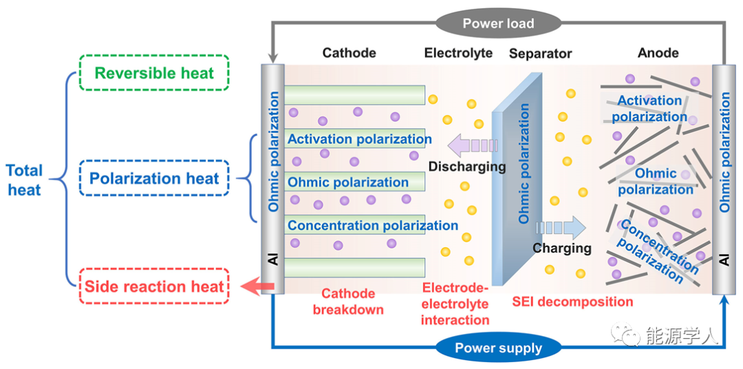 熱來源:如圖1所示,鈉離子電池運(yùn)行過程中產(chǎn)生的熱量可分為三類:可逆熱Qr、極化熱Qp和副反應(yīng)熱Qs??赡鏌?em style="margin: 0px; padding: 0px; max-width: 100%; box-sizing: border-box !important; overflow-wrap: break-word !important;">Qr,通常是由于電化學(xué)反應(yīng)過程中的可逆熵變ΔS引起的,極化熱Qp是指充放電過程中由于歐姆極化、活化極化和濃差極化造成額外的能量消耗而產(chǎn)生的熱量。Qs指在電池化學(xué)/電化學(xué)副反應(yīng)引起的不可逆熱,包括負(fù)極表面SEI和正極表面CEI的分解,電解質(zhì)和電極材料之間的反應(yīng)等。根據(jù)電化學(xué)反應(yīng)和材料的本征性質(zhì)不同,Qr既可能是吸熱也可能是放熱過程,而Qp和Qs通常為放熱過程。如果電池中的放熱反應(yīng)失控,就會發(fā)生熱失控事件,這是SIBs最具災(zāi)難性的失效模式之一。