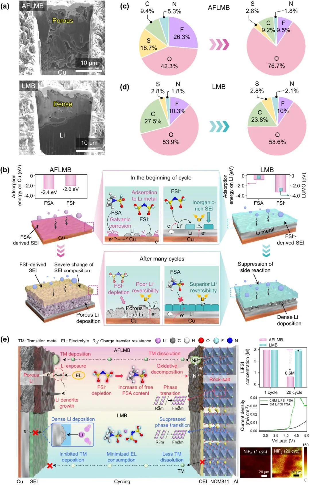 圖1. (a) 銅箔和鋰金屬陽極鍍鋰后的截面 SEM 圖。(b) 根據最低未占分子軌道(LUMO)能級以及 FSA 溶劑和 FSI-陰離子在 Cu 和鋰金屬上的吸附傾向的結果,Cu 銅箔和鋰金屬陽極在第一個周期鍍鋰前后 SEI 成分的變化示意圖。XPS 分析得出的原子百分比:(c) AFLMB 中的銅箔和 (d) LMB 中的鋰金屬陽極,在 AFLMB 首次充電期間,鍍鋰前充電至 3.7 V 和鍍鋰后充電至 4.25 V 時的對比。(e)通過比較分析(循環(huán)過程中 LiFSI 濃度的變化、LSV 和 TOF-SIMS 圖像)發(fā)現,使用 3 M LiFSI FSA 電解液的 AFLMB 和 LMB 的界面現象存在差異。