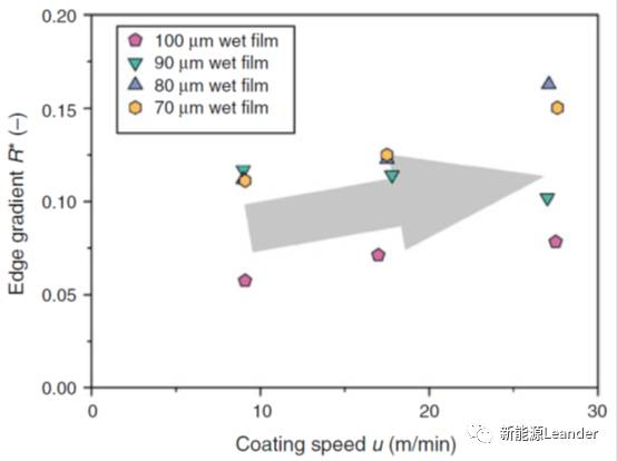 Marcel Schmitt等人鋰離子電池負(fù)極漿料涂布工藝實(shí)驗(yàn)研究發(fā)現(xiàn),涂布速度對(duì)厚邊的無量綱厚度和寬度幾乎沒有影響,而會(huì)影響厚邊的梯度特征R*,當(dāng)涂布速度增加時(shí),R*相應(yīng)增加,即厚邊緣厚度變化更尖銳,如圖5所示。