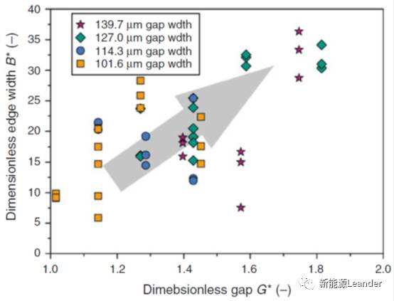 圖6為無量綱涂布間隙G*與厚邊無量綱厚度H*的實(shí)驗(yàn)數(shù)據(jù)圖和公式預(yù)測(cè)關(guān)系,根據(jù)經(jīng)驗(yàn)公式,涂布間隙增加時(shí)厚邊厚度相應(yīng)增加,但是從實(shí)驗(yàn)數(shù)據(jù)來看相關(guān)性不是特別大。而隨著涂布間隙增加,厚邊涂層的寬度增加,如圖7所示。因此,減低涂布間隙是抑制厚邊現(xiàn)象的一個(gè)有效措施。